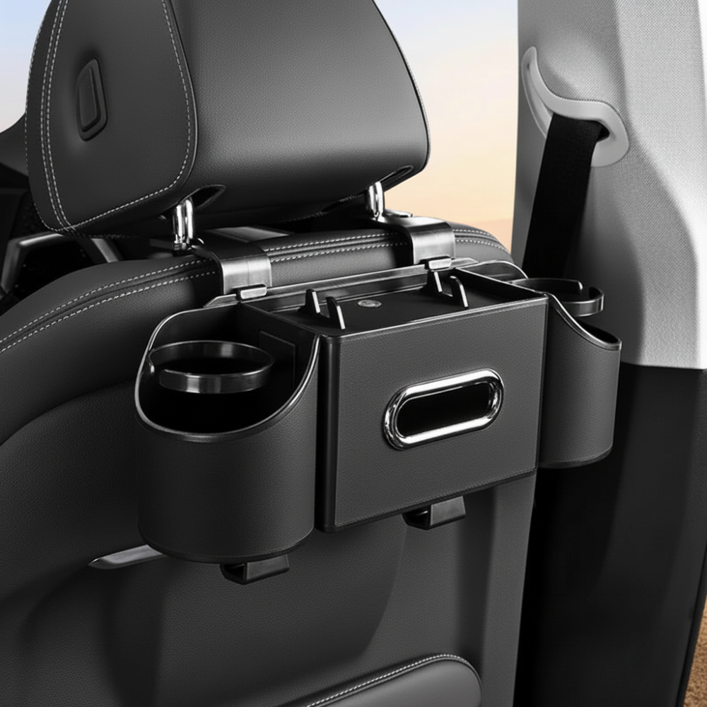 Possui compartimentos para garrafas de água, gaveta para caixa de lenços, ganchos para bolsas e suporte para telemóvel – maximizando cada centímetro do espaço do banco traseiro.